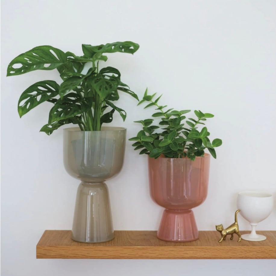 まるでオブジェのような佇まいで、お気に入りの植物をドレスアップしてくれるガラス製のポットEsmee。ぽってりと丸みを帯びたカップに、重厚感のある台座を組み合わせたようなエレガントなシルエットが特徴です。底穴のないタイプなので、植物を鉢ごと入れる鉢カバーとしてはもちろん、水を入れて花瓶として、あるいはそのままお部屋を彩るインテリアとしても多機能にお使いいただけます。