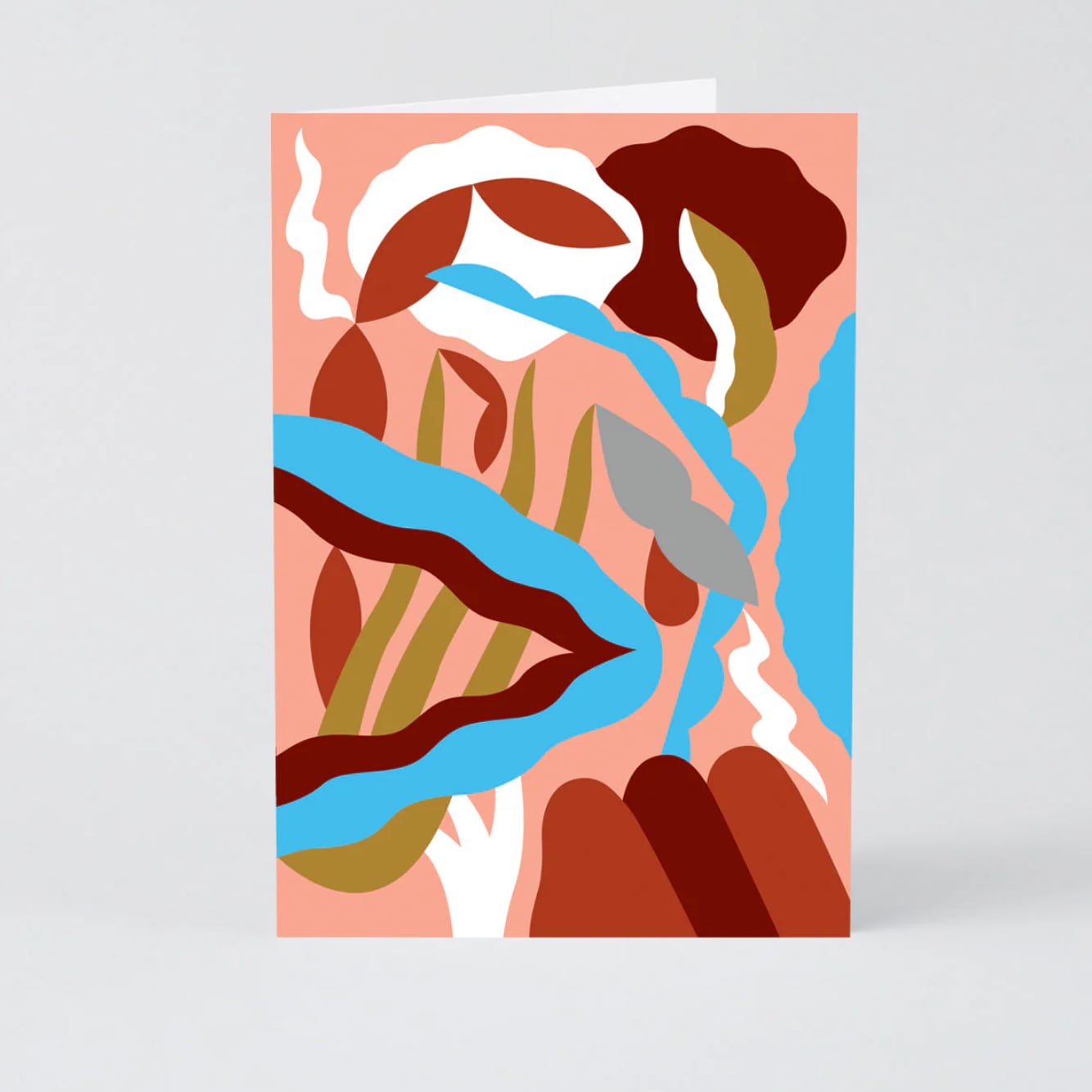 アクリル画から陶芸、紙彫刻まで幅広く手がけるセヴランの作品は、何といっても鮮やかな色彩と大胆なフォルムが魅力。この「River Reeds」と名付けられたカードでも、流れるようなラインと力強い模様が画面いっぱいに広がり、彼の独創的な世界観を存分に味わうことができます。
