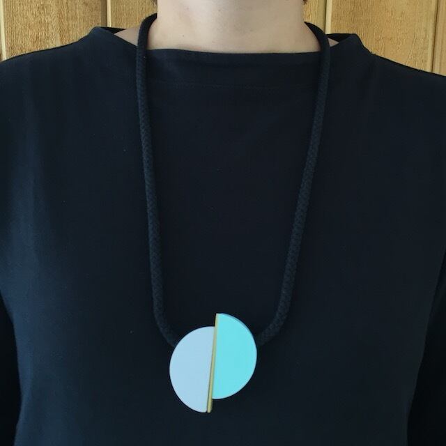 落ち着きのある素敵なKlee。上品なミント色のサークルと真鍮プレート、コンクリート樹脂がまるでオブジェの様に印象的なネックレス。大胆でエレガント。調節可能な黒いロープで、お好きな長さで着用することができます。