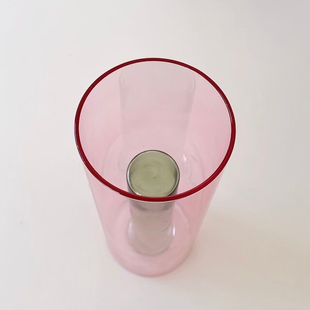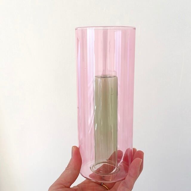 ピンク×グリーン、それぞれの色が溶け合うようなモダンな佇まいは、お花を生けていない時もアートオブジェのように空間を彩ります。窓辺に置けば、光を透過して柔らかな影を落とし、日常の何気ない景色をスタイリッシュに演出してくれそう。直径7cm、高さ18cmのサイズ感は、存在感がありながらもインテリアにスッと馴染む絶妙なフォルム。デスクや棚の上など、お気に入りの場所に彩りを添えてみませんか。
