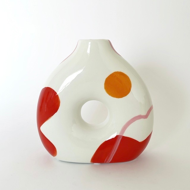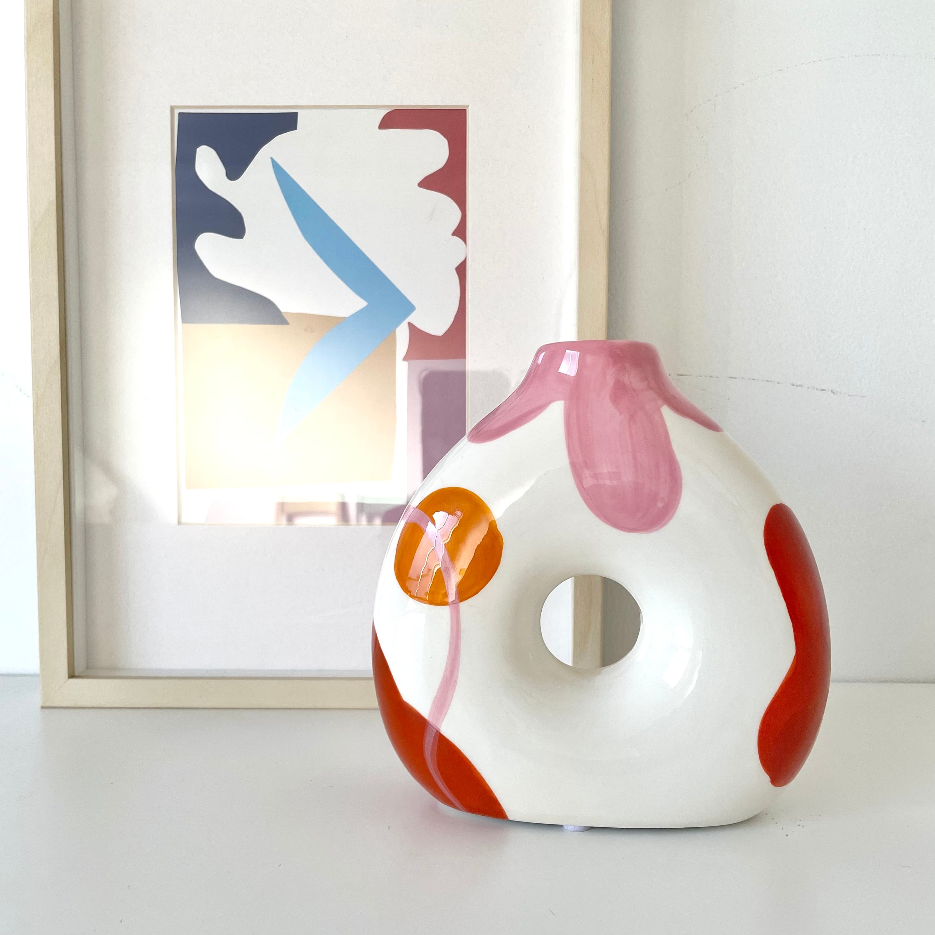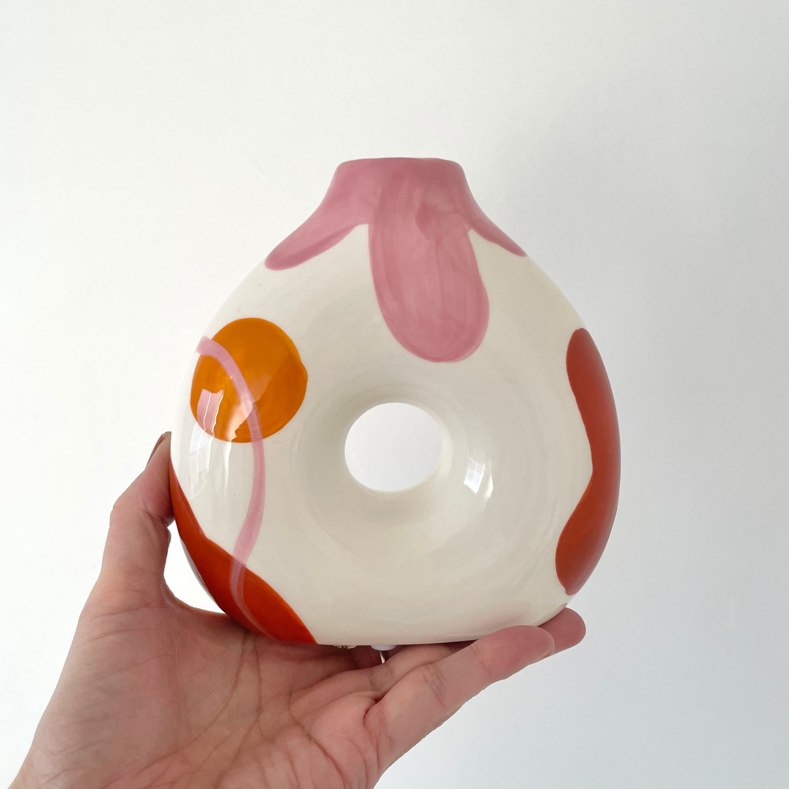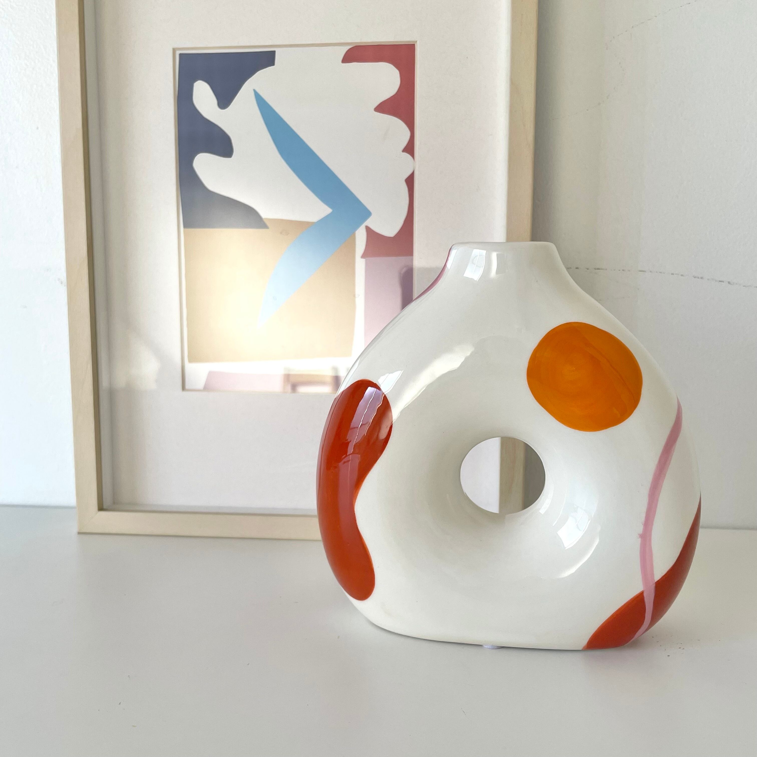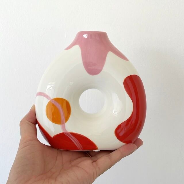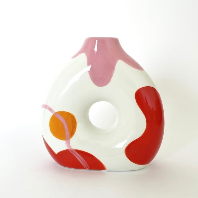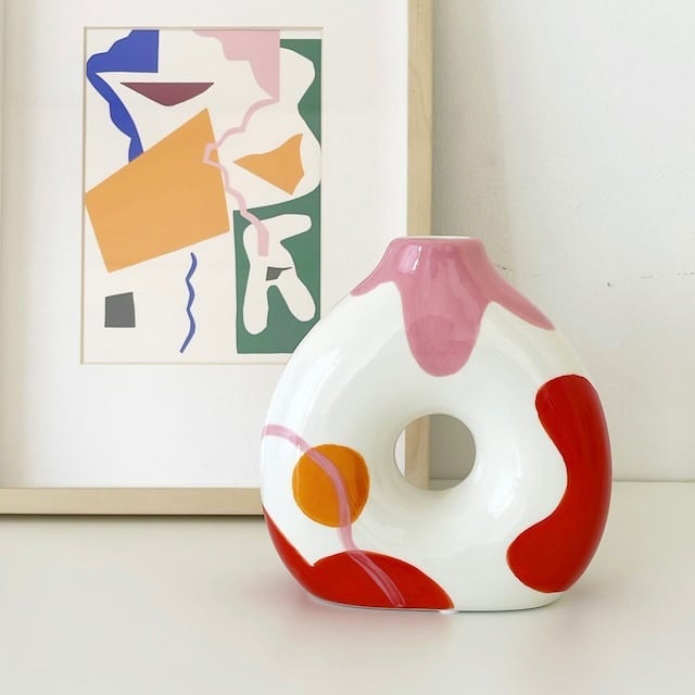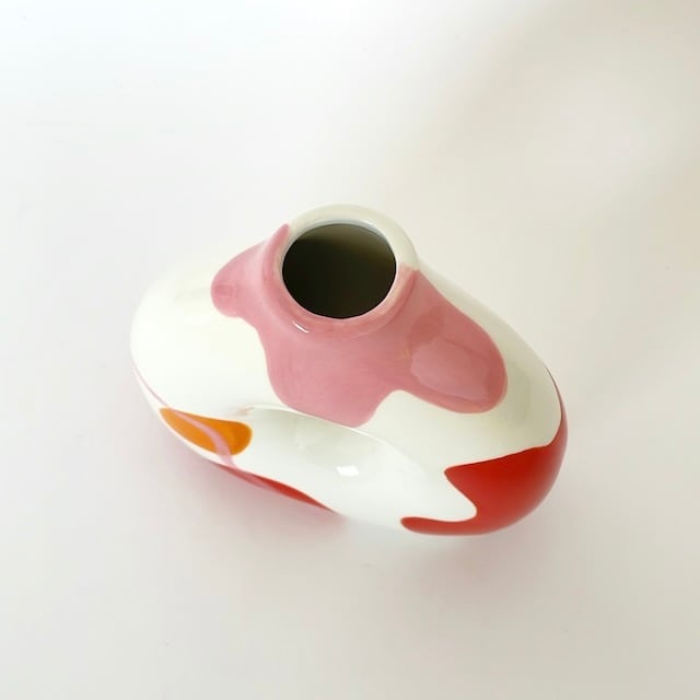 明るい色の組み合わせとユニークなパターンを使用した手作りのセラミックベース。スタイリッシュでカラフル、そして何よりもユニークなホーム アクセサリーとしてあなたの暮らしに寄り添います。インテリアのアクセントに、お気に入りのお花をいけてお楽しみください。もちろんフラワーベースだけでも存在感のあるオブジェとしてお楽しみいただけます。