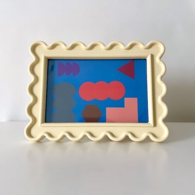 ウェーブデザインが可愛らしいフォトフレーム。一般的なハガキサイズw10×15cmが入るサイズ感。お気に入りの写真やポストカードを飾ってみてはいかがでしょうか。※一般的な写真サイズL判には少し大きいので台紙などで余白を埋めてお使い頂くと良いかと思います。